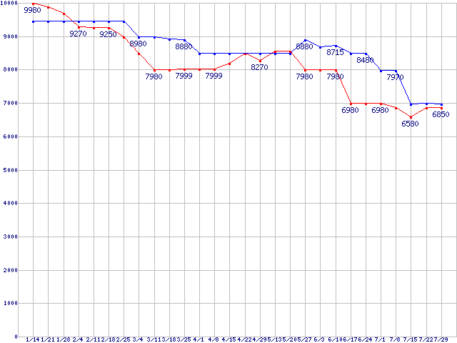 | HDD 1.5TB〜2TB未満の最安値推移 |