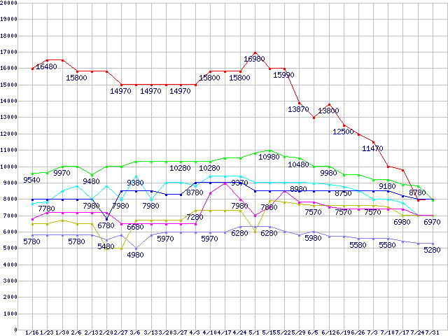 | メモリ主要製品(最安値5千円〜1万円未満)の最安値推移 |