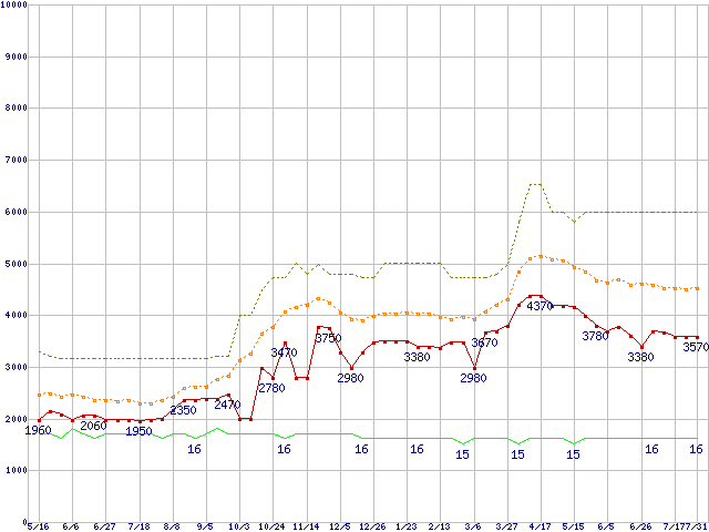 PC2-6400 2GBの価格推移↑前グラフ↓次グラフ(2009年5月16日〜2010年7月31日)※このグラフは過去のデータも税率5%相当に調整した税込み相当額のグラフです。 税率変更や、総額表示方式導入(2004年4月)の影響は除いています。●関連グラフメモリ主要製品の最安値推移2GBモジュール/1GBモジュール×2枚の最安値推移メモリ主要製品(最安値5千円未満)の最安値推移PC2-6400(DDR2-800) DDR2 SDRAM DIMMの最安値推移●凡例最安値(点線部は販売店未確認または未調査)平均値最高値ショップ数