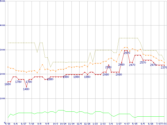 PC3-10600 1GBの価格推移↓次グラフ(2009年5月16日〜2010年7月31日)※このグラフは過去のデータも税率5%相当に調整した税込み相当額のグラフです。 税率変更や、総額表示方式導入(2004年4月)の影響は除いています。●関連グラフメモリ主要製品の最安値推移1GBモジュールの最安値推移メモリ主要製品(最安値5千円未満)の最安値推移PC3-10600(DDR3-1333) DDR3 SDRAM DIMMの最安値推移●凡例最安値(点線部は販売店未確認または未調査)平均値最高値ショップ数