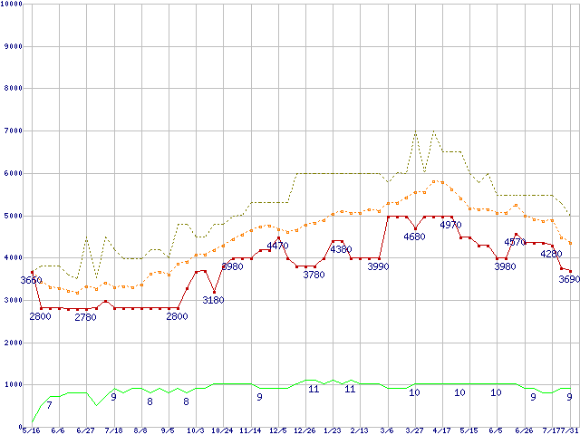 PC3-10600 2GBの価格推移↑前グラフ↓次グラフ(2009年5月16日〜2010年7月31日)※このグラフは過去のデータも税率5%相当に調整した税込み相当額のグラフです。 税率変更や、総額表示方式導入(2004年4月)の影響は除いています。●関連グラフメモリ主要製品の最安値推移2GBモジュール/1GBモジュール×2枚の最安値推移メモリ主要製品(最安値5千円未満)の最安値推移PC3-10600(DDR3-1333) DDR3 SDRAM DIMMの最安値推移●凡例最安値(点線部は販売店未確認または未調査)平均値最高値ショップ数