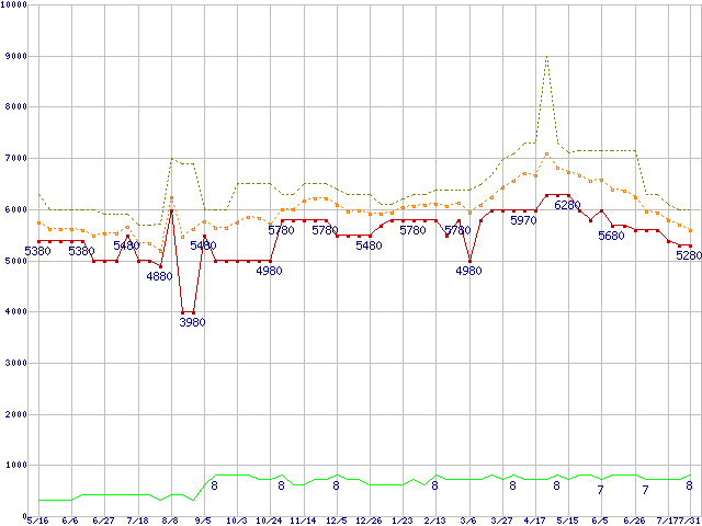 PC3-12800 1GB×2枚組みセットの価格推移↑前グラフ↓次グラフ(2009年5月16日〜2010年7月31日)※このグラフは過去のデータも税率5%相当に調整した税込み相当額のグラフです。 税率変更や、総額表示方式導入(2004年4月)の影響は除いています。●関連グラフメモリ主要製品の最安値推移2GBモジュール/1GBモジュール×2枚の最安値推移メモリ主要製品(最安値5千円〜1万円未満)の最安値推移PC3-12800(DDR3-1600) DDR3 SDRAM DIMMの最安値推移●凡例最安値(点線部は販売店未確認または未調査)平均値最高値ショップ数
