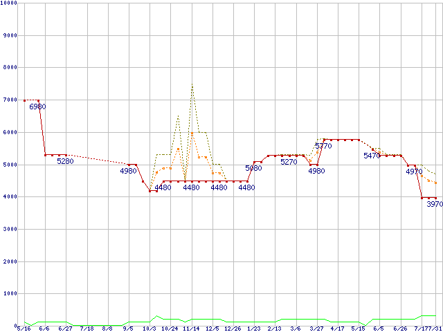 PC3-12800 2GBの価格推移↑前グラフ↓次グラフ(2009年5月16日〜2010年7月31日)※このグラフは過去のデータも税率5%相当に調整した税込み相当額のグラフです。 税率変更や、総額表示方式導入(2004年4月)の影響は除いています。●関連グラフメモリ主要製品の最安値推移2GBモジュール/1GBモジュール×2枚の最安値推移メモリ主要製品(最安値5千円未満)の最安値推移PC3-12800(DDR3-1600) DDR3 SDRAM DIMMの最安値推移●凡例最安値(点線部は販売店未確認または未調査)平均値最高値ショップ数