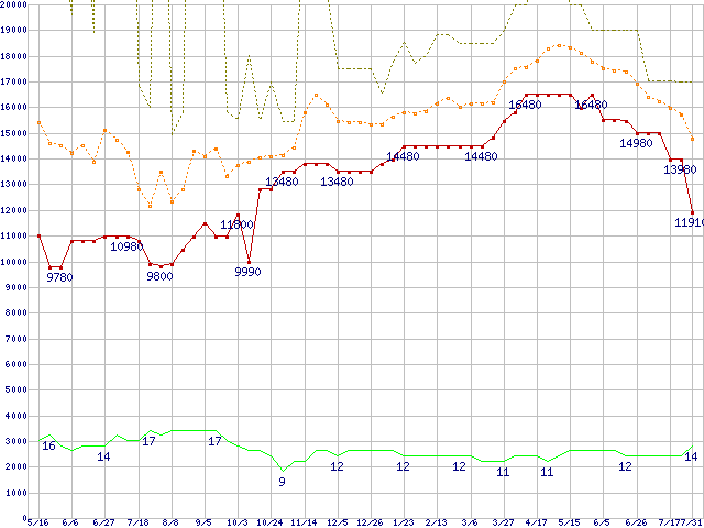 PC3-12800 2GB×3枚組みセットの価格推移↑前グラフ↓次グラフ(2009年5月16日〜2010年7月31日)※このグラフは過去のデータも税率5%相当に調整した税込み相当額のグラフです。 税率変更や、総額表示方式導入(2004年4月)の影響は除いています。●関連グラフメモリ主要製品の最安値推移メモリ主要製品(最安値1万円以上)の最安値推移PC3-12800(DDR3-1600) DDR3 SDRAM DIMMの最安値推移●凡例最安値(点線部は販売店未確認または未調査)平均値最高値ショップ数