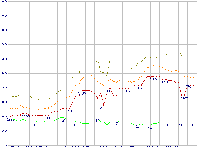 PC2-6400 1GB×2枚組みセットの価格推移↑前グラフ↓次グラフ(2009年5月16日〜2010年7月31日)※このグラフは過去のデータも税率5%相当に調整した税込み相当額のグラフです。 税率変更や、総額表示方式導入(2004年4月)の影響は除いています。●関連グラフメモリ主要製品の最安値推移2GBモジュール/1GBモジュール×2枚の最安値推移メモリ主要製品(最安値5千円未満)の最安値推移PC2-6400(DDR2-800) DDR2 SDRAM DIMMの最安値推移●凡例最安値(点線部は販売店未確認または未調査)平均値最高値ショップ数