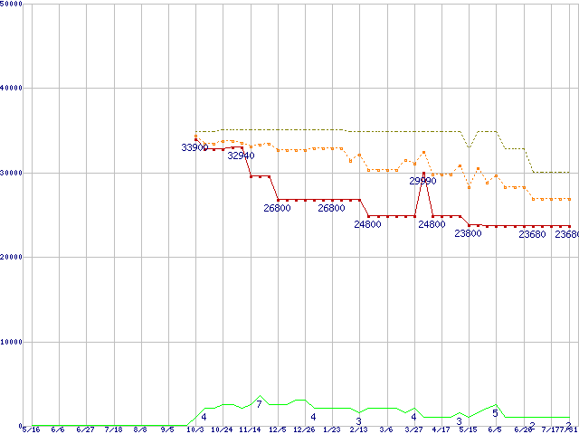 PC2-6400 4GB×2枚組みセットの価格推移↑前グラフ↓次グラフ(2009年5月16日〜2010年7月31日)※このグラフは過去のデータも税率5%相当に調整した税込み相当額のグラフです。 税率変更や、総額表示方式導入(2004年4月)の影響は除いています。●関連グラフメモリ主要製品の最安値推移メモリ主要製品(最安値1万円以上)の最安値推移PC2-6400(DDR2-800) DDR2 SDRAM DIMMの最安値推移●凡例最安値(点線部は販売店未確認または未調査)平均値最高値ショップ数