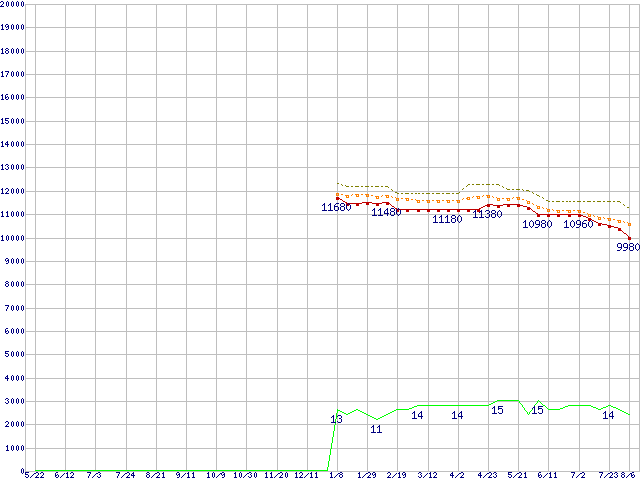 Core i3-530 (2.93GHz)の価格推移↑前グラフ↓次グラフ(2009年5月22日〜2010年8月6日)※このグラフは過去のデータも税率5%相当に調整した税込み相当額のグラフです。●関連グラフCPU主要製品の最安値推移CPU主要製品(最安値1万円未満)の最安値推移Intel系CPUの最安値推移LGA1156 (L3キャッシュ4MB,Dual Core,GPU内蔵,Hyper-Threading,TDP 73〜87W)の最安値推移●凡例最安値(点線部は販売店未確認または未調査)平均値最高値ショップ数
