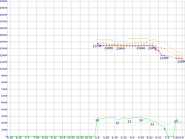 Core i3-540 (3.06GHz)の価格推移↑前グラフ↓次グラフ(2009年5月22日〜2010年8月6日)※このグラフは過去のデータも税率5%相当に調整した税込み相当額のグラフです。●関連グラフCPU主要製品の最安値推移CPU主要製品(最安値1万円〜2万円未満)の最安値推移Intel系CPUの最安値推移LGA1156 (L3キャッシュ4MB,Dual Core,GPU内蔵,Hyper-Threading,TDP 73〜87W)の最安値推移●凡例最安値(点線部は販売店未確認または未調査)平均値最高値ショップ数