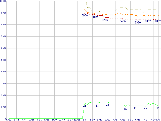 Pentium G6950 (2.8GHz)の価格推移↑前グラフ↓次グラフ(2009年5月22日〜2010年8月6日)※このグラフは過去のデータも税率5%相当に調整した税込み相当額のグラフです。●関連グラフCPU主要製品の最安値推移CPU主要製品(最安値1万円未満)の最安値推移Intel系CPUの最安値推移LGA1156 (L3キャッシュ3MB,Dual Core,GPU内蔵,TDP 73W)の最安値推移●凡例最安値(点線部は販売店未確認または未調査)平均値最高値ショップ数