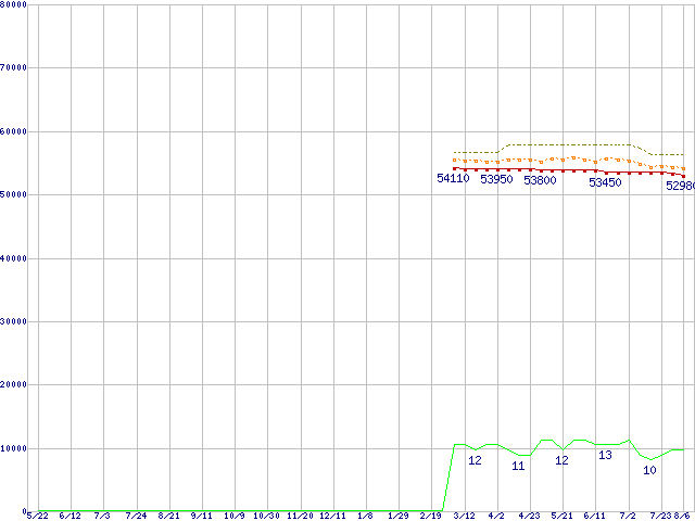 Core i7-960 (3.20GHz)の価格推移↑前グラフ↓次グラフ(2009年5月22日〜2010年8月6日)※このグラフは過去のデータも税率5%相当に調整した税込み相当額のグラフです。●関連グラフCPU主要製品の最安値推移CPU主要製品(最安値3万円〜6万円未満)の最安値推移Intel系CPUの最安値推移LGA1366 (QPI 4.8GT/s,L3キャッシュ8MB,Quad Core,Hyper-Threading,TDP 130W)の最安値推移●凡例最安値(点線部は販売店未確認または未調査)平均値最高値ショップ数