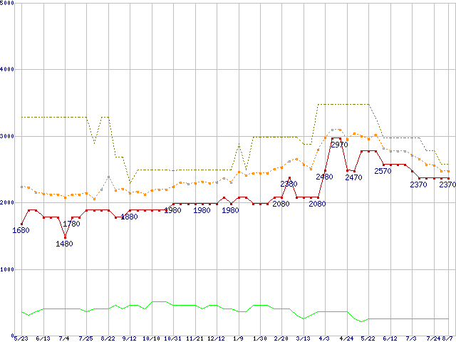 PC3-10600 1GBの価格推移↓次グラフ(2009年5月23日〜2010年8月7日)※このグラフは過去のデータも税率5%相当に調整した税込み相当額のグラフです。 税率変更や、総額表示方式導入(2004年4月)の影響は除いています。●関連グラフメモリ主要製品の最安値推移1GBモジュールの最安値推移メモリ主要製品(最安値5千円未満)の最安値推移PC3-10600(DDR3-1333) DDR3 SDRAM DIMMの最安値推移●凡例最安値(点線部は販売店未確認または未調査)平均値最高値ショップ数