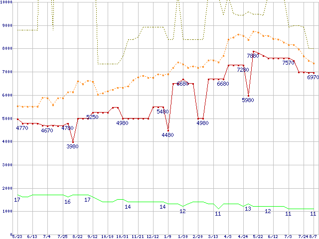 PC3-10600 1GB×3枚組みセットの価格推移↑前グラフ↓次グラフ(2009年5月23日〜2010年8月7日)※このグラフは過去のデータも税率5%相当に調整した税込み相当額のグラフです。 税率変更や、総額表示方式導入(2004年4月)の影響は除いています。●関連グラフメモリ主要製品の最安値推移メモリ主要製品(最安値5千円〜1万円未満)の最安値推移PC3-10600(DDR3-1333) DDR3 SDRAM DIMMの最安値推移●凡例最安値(点線部は販売店未確認または未調査)平均値最高値ショップ数