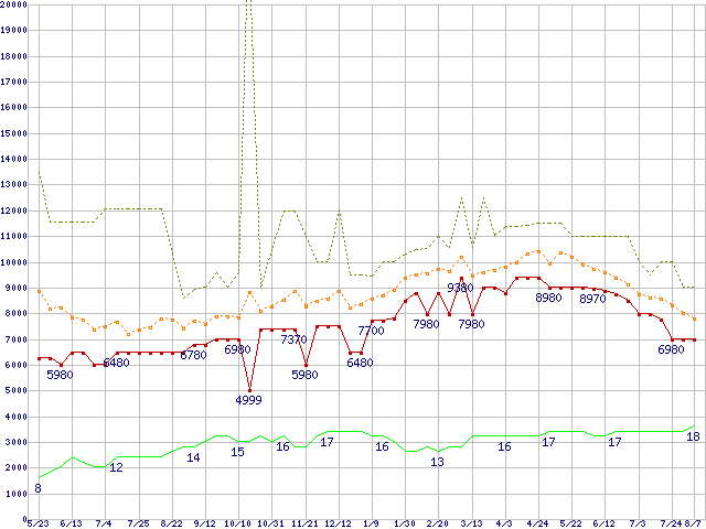 PC3-10600 2GB×2枚組みセットの価格推移↑前グラフ↓次グラフ(2009年5月23日〜2010年8月7日)※このグラフは過去のデータも税率5%相当に調整した税込み相当額のグラフです。 税率変更や、総額表示方式導入(2004年4月)の影響は除いています。●関連グラフメモリ主要製品の最安値推移4GBモジュール/2GBモジュール×2枚の最安値推移メモリ主要製品(最安値5千円〜1万円未満)の最安値推移PC3-10600(DDR3-1333) DDR3 SDRAM DIMMの最安値推移●凡例最安値(点線部は販売店未確認または未調査)平均値最高値ショップ数