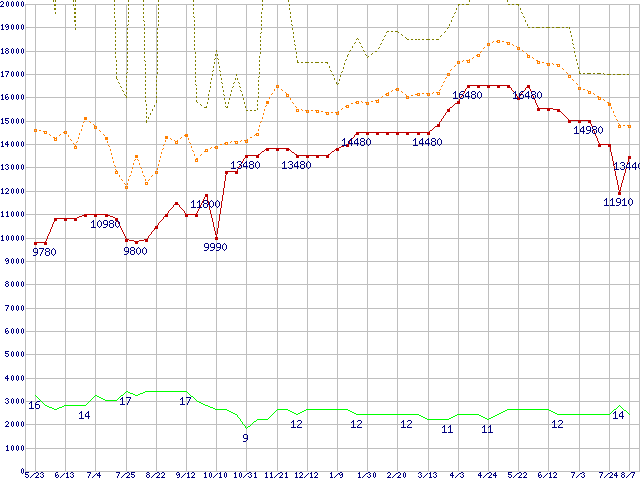 PC3-12800 2GB×3枚組みセットの価格推移↑前グラフ↓次グラフ(2009年5月23日〜2010年8月7日)※このグラフは過去のデータも税率5%相当に調整した税込み相当額のグラフです。 税率変更や、総額表示方式導入(2004年4月)の影響は除いています。●関連グラフメモリ主要製品の最安値推移メモリ主要製品(最安値1万円以上)の最安値推移PC3-12800(DDR3-1600) DDR3 SDRAM DIMMの最安値推移●凡例最安値(点線部は販売店未確認または未調査)平均値最高値ショップ数
