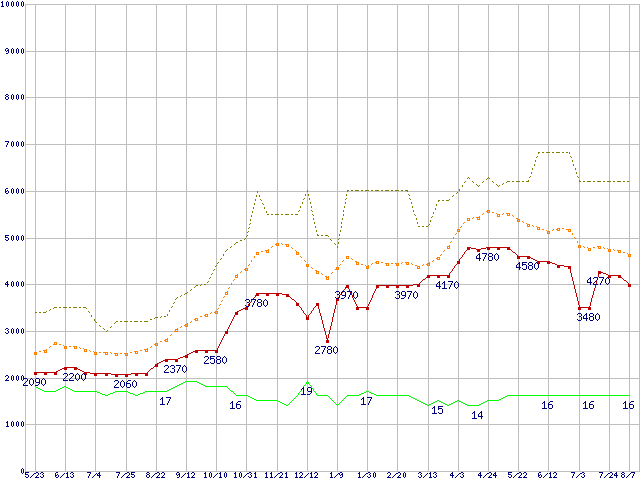 PC2-6400 1GB×2枚組みセットの価格推移↑前グラフ↓次グラフ(2009年5月23日〜2010年8月7日)※このグラフは過去のデータも税率5%相当に調整した税込み相当額のグラフです。 税率変更や、総額表示方式導入(2004年4月)の影響は除いています。●関連グラフメモリ主要製品の最安値推移2GBモジュール/1GBモジュール×2枚の最安値推移メモリ主要製品(最安値5千円未満)の最安値推移PC2-6400(DDR2-800) DDR2 SDRAM DIMMの最安値推移●凡例最安値(点線部は販売店未確認または未調査)平均値最高値ショップ数