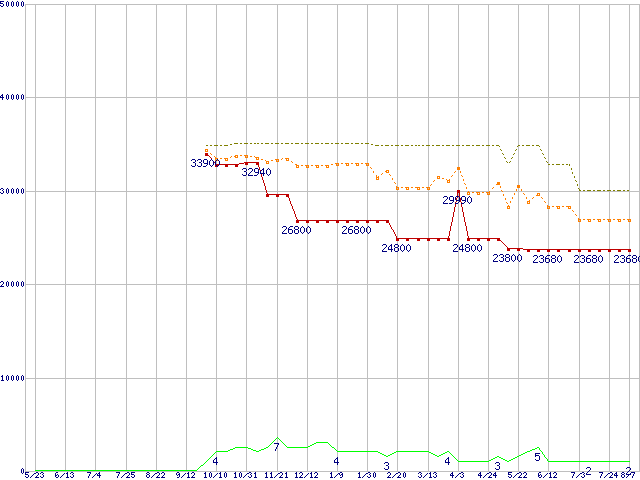 PC2-6400 4GB×2枚組みセットの価格推移↑前グラフ↓次グラフ(2009年5月23日〜2010年8月7日)※このグラフは過去のデータも税率5%相当に調整した税込み相当額のグラフです。 税率変更や、総額表示方式導入(2004年4月)の影響は除いています。●関連グラフメモリ主要製品の最安値推移メモリ主要製品(最安値1万円以上)の最安値推移PC2-6400(DDR2-800) DDR2 SDRAM DIMMの最安値推移●凡例最安値(点線部は販売店未確認または未調査)平均値最高値ショップ数