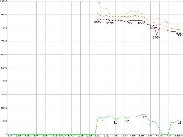 Pentium E6600 (3.06GHz,L2 2MB)の価格推移↑前グラフ↓次グラフ(2009年6月5日〜2010年8月20日)※このグラフは過去のデータも税率5%相当に調整した税込み相当額のグラフです。●関連グラフCPU主要製品の最安値推移CPU主要製品(最安値1万円未満)の最安値推移Intel系CPUの最安値推移LGA775 (FSB 1066MHz,Dual Core,TDP 65W)の最安値推移●凡例最安値(点線部は販売店未確認または未調査)平均値最高値ショップ数