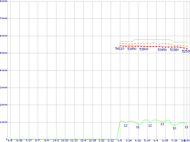 Core i7-960 (3.20GHz)の価格推移↑前グラフ↓次グラフ(2009年6月5日〜2010年8月20日)※このグラフは過去のデータも税率5%相当に調整した税込み相当額のグラフです。●関連グラフCPU主要製品の最安値推移CPU主要製品(最安値3万円〜6万円未満)の最安値推移Intel系CPUの最安値推移LGA1366 (QPI 4.8GT/s,L3キャッシュ8MB,Quad Core,Hyper-Threading,TDP 130W)の最安値推移●凡例最安値(点線部は販売店未確認または未調査)平均値最高値ショップ数