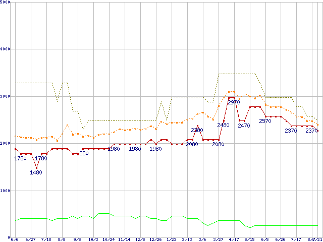 PC3-10600 1GBの価格推移↓次グラフ(2009年6月6日〜2010年8月21日)※このグラフは過去のデータも税率5%相当に調整した税込み相当額のグラフです。 税率変更や、総額表示方式導入(2004年4月)の影響は除いています。●関連グラフメモリ主要製品の最安値推移1GBモジュールの最安値推移メモリ主要製品(最安値5千円未満)の最安値推移PC3-10600(DDR3-1333) DDR3 SDRAM DIMMの最安値推移●凡例最安値(点線部は販売店未確認または未調査)平均値最高値ショップ数