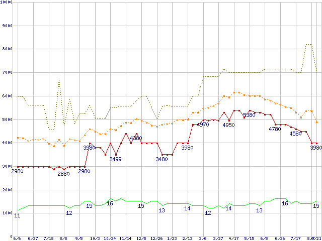 PC3-10600 1GB×2枚組みセットの価格推移↑前グラフ↓次グラフ(2009年6月6日〜2010年8月21日)※このグラフは過去のデータも税率5%相当に調整した税込み相当額のグラフです。 税率変更や、総額表示方式導入(2004年4月)の影響は除いています。●関連グラフメモリ主要製品の最安値推移2GBモジュール/1GBモジュール×2枚の最安値推移メモリ主要製品(最安値5千円未満)の最安値推移PC3-10600(DDR3-1333) DDR3 SDRAM DIMMの最安値推移●凡例最安値(点線部は販売店未確認または未調査)平均値最高値ショップ数