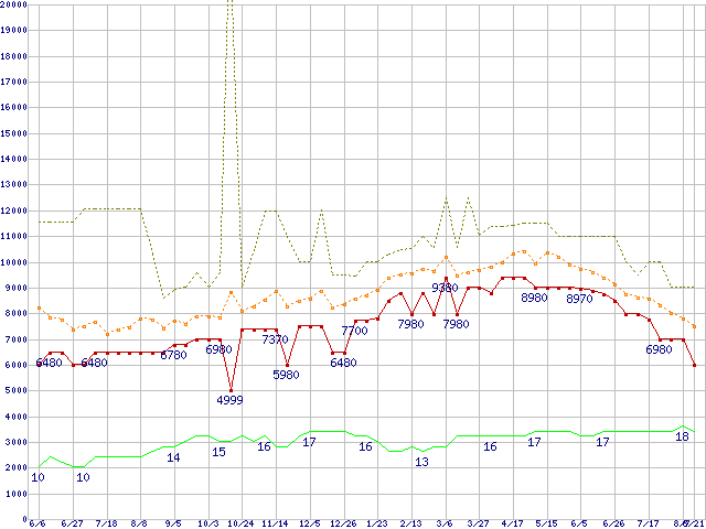 PC3-10600 2GB×2枚組みセットの価格推移↑前グラフ↓次グラフ(2009年6月6日〜2010年8月21日)※このグラフは過去のデータも税率5%相当に調整した税込み相当額のグラフです。 税率変更や、総額表示方式導入(2004年4月)の影響は除いています。●関連グラフメモリ主要製品の最安値推移4GBモジュール/2GBモジュール×2枚の最安値推移メモリ主要製品(最安値5千円〜1万円未満)の最安値推移PC3-10600(DDR3-1333) DDR3 SDRAM DIMMの最安値推移●凡例最安値(点線部は販売店未確認または未調査)平均値最高値ショップ数
