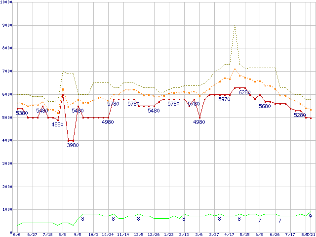 PC3-12800 1GB×2枚組みセットの価格推移↑前グラフ↓次グラフ(2009年6月6日〜2010年8月21日)※このグラフは過去のデータも税率5%相当に調整した税込み相当額のグラフです。 税率変更や、総額表示方式導入(2004年4月)の影響は除いています。●関連グラフメモリ主要製品の最安値推移2GBモジュール/1GBモジュール×2枚の最安値推移メモリ主要製品(最安値5千円未満)の最安値推移PC3-12800(DDR3-1600) DDR3 SDRAM DIMMの最安値推移●凡例最安値(点線部は販売店未確認または未調査)平均値最高値ショップ数