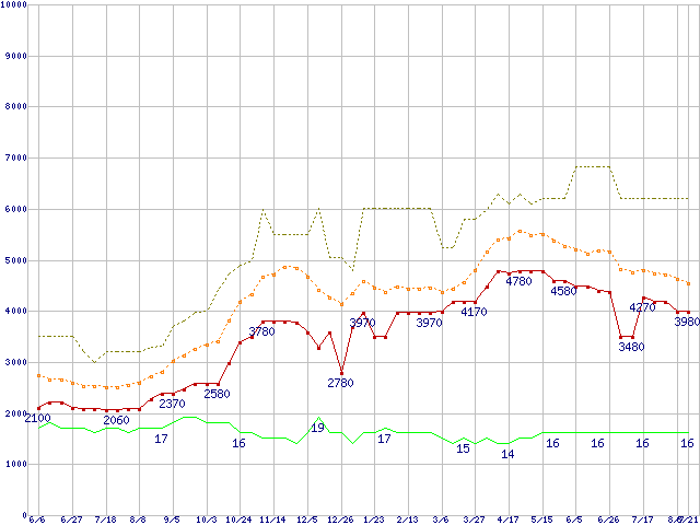 PC2-6400 1GB×2枚組みセットの価格推移↑前グラフ↓次グラフ(2009年6月6日〜2010年8月21日)※このグラフは過去のデータも税率5%相当に調整した税込み相当額のグラフです。 税率変更や、総額表示方式導入(2004年4月)の影響は除いています。●関連グラフメモリ主要製品の最安値推移2GBモジュール/1GBモジュール×2枚の最安値推移メモリ主要製品(最安値5千円未満)の最安値推移PC2-6400(DDR2-800) DDR2 SDRAM DIMMの最安値推移●凡例最安値(点線部は販売店未確認または未調査)平均値最高値ショップ数