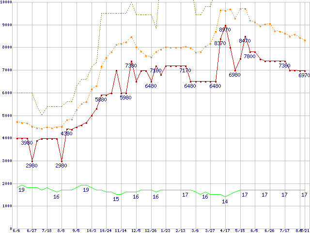 PC2-6400 2GB×2枚組みセットの価格推移↑前グラフ↓次グラフ(2009年6月6日〜2010年8月21日)※このグラフは過去のデータも税率5%相当に調整した税込み相当額のグラフです。 税率変更や、総額表示方式導入(2004年4月)の影響は除いています。●関連グラフメモリ主要製品の最安値推移4GBモジュール/2GBモジュール×2枚の最安値推移メモリ主要製品(最安値5千円〜1万円未満)の最安値推移PC2-6400(DDR2-800) DDR2 SDRAM DIMMの最安値推移●凡例最安値(点線部は販売店未確認または未調査)平均値最高値ショップ数