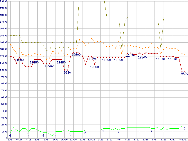PC2-6400 4GBの価格推移↑前グラフ(2009年6月6日〜2010年8月21日)※このグラフは過去のデータも税率5%相当に調整した税込み相当額のグラフです。 税率変更や、総額表示方式導入(2004年4月)の影響は除いています。●関連グラフメモリ主要製品の最安値推移4GBモジュール/2GBモジュール×2枚の最安値推移メモリ主要製品(最安値5千円〜1万円未満)の最安値推移PC2-6400(DDR2-800) DDR2 SDRAM DIMMの最安値推移●凡例最安値(点線部は販売店未確認または未調査)平均値最高値ショップ数