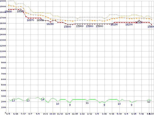 Core 2 Quad Q8400 (2.66GHz,L2 2MB×2)の価格推移↑前グラフ↓次グラフ(2009年6月5日〜2010年8月20日)※このグラフは過去のデータも税率5%相当に調整した税込み相当額のグラフです。●関連グラフCPU主要製品の最安値推移CPU主要製品(最安値1万円〜2万円未満)の最安値推移Intel系CPUの最安値推移LGA775 (FSB 1333MHz,Quad Core,TDP 95W)の最安値推移●凡例最安値(点線部は販売店未確認または未調査)平均値最高値ショップ数