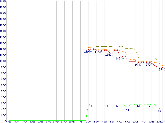 Athlon II X4 635 (2.9GHz,L2 512KB×4,TDP 95W)の価格推移↑前グラフ↓次グラフ(2009年6月12日〜2010年8月27日)※このグラフは過去のデータも税率5%相当に調整した税込み相当額のグラフです。●関連グラフCPU主要製品の最安値推移CPU主要製品(最安値1万円未満)の最安値推移AMD系CPUの最安値推移Socket AM3 (Quad Core)の最安値推移●凡例最安値(点線部は販売店未確認または未調査)平均値最高値ショップ数