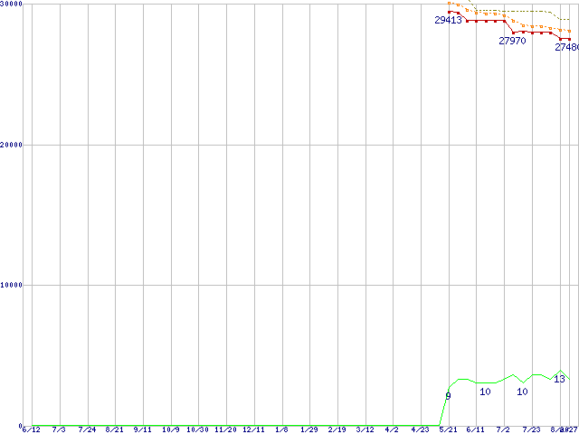 Core i5-680 (3.6GHz)の価格推移↑前グラフ↓次グラフ(2009年6月12日〜2010年8月27日)※このグラフは過去のデータも税率5%相当に調整した税込み相当額のグラフです。●関連グラフCPU主要製品の最安値推移CPU主要製品(最安値2万円〜3万円未満)の最安値推移Intel系CPUの最安値推移LGA1156 (L3キャッシュ4MB,Dual Core,GPU内蔵,Hyper-Threading,TDP 73〜87W)の最安値推移●凡例最安値(点線部は販売店未確認または未調査)平均値最高値ショップ数