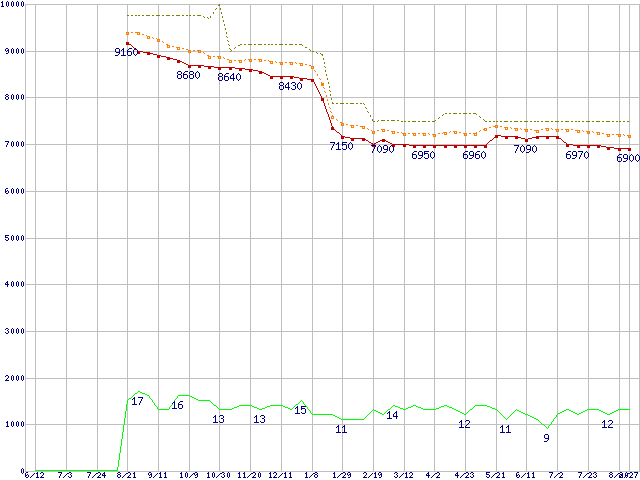 Pentium E6500 (2.93GHz,L2 2MB)の価格推移↑前グラフ↓次グラフ(2009年6月12日〜2010年8月27日)※このグラフは過去のデータも税率5%相当に調整した税込み相当額のグラフです。●関連グラフCPU主要製品の最安値推移CPU主要製品(最安値1万円未満)の最安値推移Intel系CPUの最安値推移LGA775 (FSB 1066MHz,Dual Core,TDP 65W)の最安値推移●凡例最安値(点線部は販売店未確認または未調査)平均値最高値ショップ数