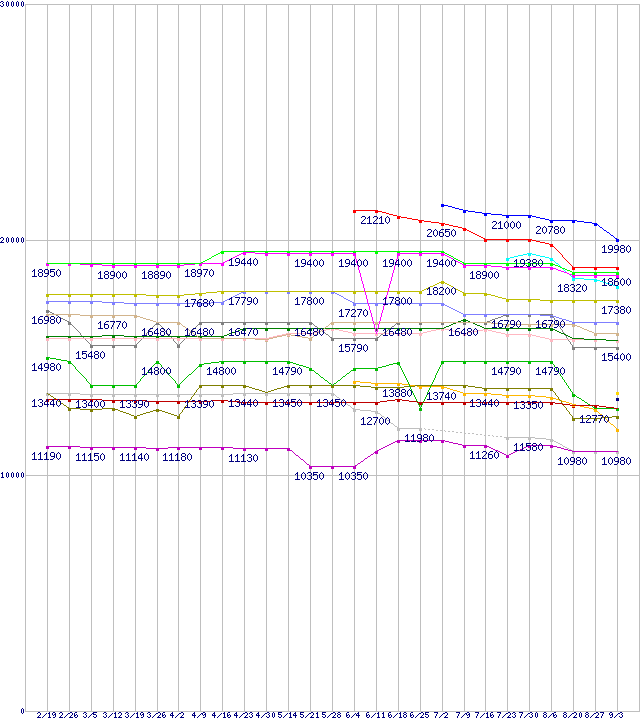 CPU主要製品(最安値1万円〜2万円未満)の最安値推移↑前グラフ↓次グラフ(2010年2月19日〜2010年9月3日)※このグラフは過去のデータも税率5%相当に調整した税込み相当額のグラフです。凡例Phenom II X6 1055T (2.8GHz,L2 512KB×6,L3 6MB,TDP 95W)Core i5-655K (3.2GHz)Core i5-661 (3.33GHz)Core i5-660 (3.33GHz)Core i5-760 (2.8GHz)Core 2 Duo E8500 (3.16GHz,L2 6MB)Core i5-650 (3.2GHz)Phenom II X4 910e (2.6GHz,L2 512KB×4,L3 6MB,TDP 65W)Core 2 Quad Q8400 (2.66GHz,L2 2MB×2)Core 2 Duo E8400 (3GHz,L2 6MB)Phenom II X4 965 Black Edition (3.4GHz,L2 512KB×4,L3 6MB,TDP 125W)Phenom II X4 955 (3.2GHz,L2 512KB×4,L3 6MB,TDP 95W)Core i3-560 (3.33GHz)Core 2 Duo E7600 (3.06GHz,L2 3MB)Phenom II X4 955 Black Edition (3.2GHz,L2 512KB×4,L3 6MB,TDP 125W)Phenom II X4 945 (3.0GHz,L2 512KB×4,L3 6MB,TDP 95W)Core i3-550 (3.20GHz)Core 2 Duo E7500 (2.93GHz,L2 3MB)Core i3-540 (3.06GHz)※製品名をクリックすると個別のグラフを表示します※点線部は販売店が確認できなかった、または調査データがないことを示します