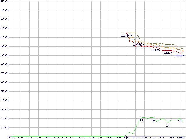 Core i7-980X Extreme Edition (3.33GHz)の価格推移↑前グラフ↓次グラフ(2009年6月19日〜2010年9月3日)※このグラフは過去のデータも税率5%相当に調整した税込み相当額のグラフです。●関連グラフCPU主要製品の最安値推移CPU主要製品(最安値6万円以上)の最安値推移Intel系CPUの最安値推移LGA1366 (QPI 6.4GT/s,L3キャッシュ12MB,6Core,Hyper-Threading,TDP 130W)の最安値推移●凡例最安値(点線部は販売店未確認または未調査)平均値最高値ショップ数