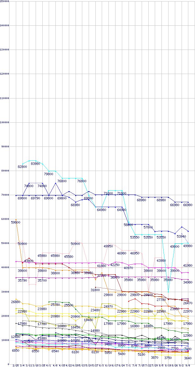 HDD/SSD主要製品の最安値推移↑前グラフ↓次グラフ(2010年2月25日〜2010年9月9日)※このグラフは過去のデータも税率5%相当に調整した税込み相当額のグラフです。 税率変更や、総額表示方式導入(2004年4月)の影響は除いています。凡例その他2.5インチSSD 512GB (512GB,MLC)SSDSA2SH064G1C5 (64GB,SLC)CTFDDAC256MAG-1G1 (256GB,MLC)Real SSD C300 Micron純正/OEM品 (256GB,MLC)2.5インチSSD(SandForce製コントローラ) (200〜240GB,MLC)その他2.5インチSSD 256GB (256GB,MLC)X25-M(G2) (160GB,MLC)SSDSA2SH032G1 (32GB,SLC)Real SSD C300 Micron純正/OEM品 (128GB,MLC)WD6000HLHX (600.0GB)CTFDDAC128MAG-1G1 (128GB,MLC)WD4500HLHX (450.0GB)2.5インチSSD(SandForce製コントローラ) (100〜120GB,MLC)ST32000641AS (2TB,64MB)X25-M(G2)OEM品SSD (80GB,MLC)X25-M(G2) (80GB,MLC)その他2.5インチSSD 128GB (128GB,MLC)Real SSD C300 Micron純正/OEM品 (64GB,MLC)CTFDDAC064MAG-1G1 (64GB,MLC)2.5インチSSD(SandForce製コントローラ) (50〜60GB,MLC)0S02602(純正パッケージ品) (2TB,32MB)HDS722020ALA330 (2TB,32MB)その他2.5インチSSD 64GB (64GB,MLC)ST32000542AS (2TB,32MB)WD10TPVT (1TB,8MB,12.5mm厚)HD204UI (2TB,32MB)WD7500BPVT (750GB,8MB)WD20EARS (2TB,64MB)WD1002FAEX (1TB,64MB)その他2.5インチSSD 32GB (32GB,MLC)WD15EARS (1.5TB,64MB)WD6400BPVT (640GB,8MB)HD154UI (1.5TB,32MB)ST31000528AS (1TB,32MB)0S02601(純正パッケージ品) (1TB,32MB)WD10EALS (1TB,32MB)ST31000520AS (1TB,32MB)0S02598 (500GB,8MB)HTS545050B9A300 (500GB,8MB)WD10EARS (1TB,64MB)WD5000BEVT (500GB,8MB)0S02600(純正パッケージ品) (500GB,16MB)※製品名をクリックすると個別のグラフを表示します※点線部は販売店が確認できなかった、または調査データがないことを示します