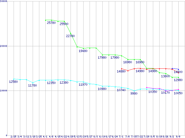 | HDD/SSD主要製品(最安値1万円〜1万5千円未満)の最安値推移 |