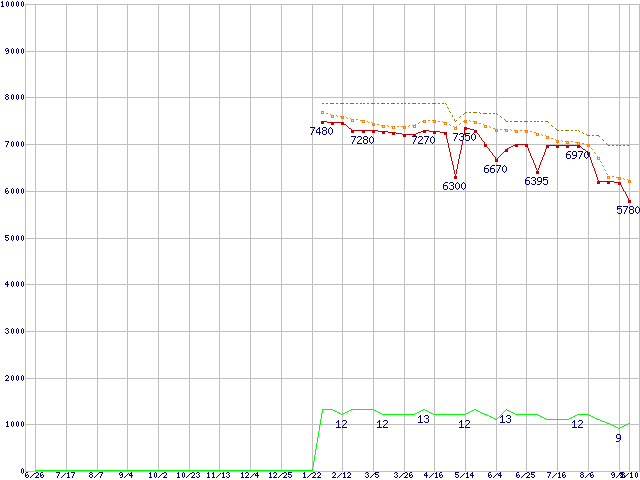Athlon II X2 255 (3.1GHz,L2 1MB×2,TDP 65W)の価格推移↑前グラフ↓次グラフ(2009年6月26日〜2010年9月10日)※このグラフは過去のデータも税率5%相当に調整した税込み相当額のグラフです。●関連グラフCPU主要製品の最安値推移CPU主要製品(最安値1万円未満)の最安値推移AMD系CPUの最安値推移Socket AM3 (Dual Core)の最安値推移●凡例最安値(点線部は販売店未確認または未調査)平均値最高値ショップ数