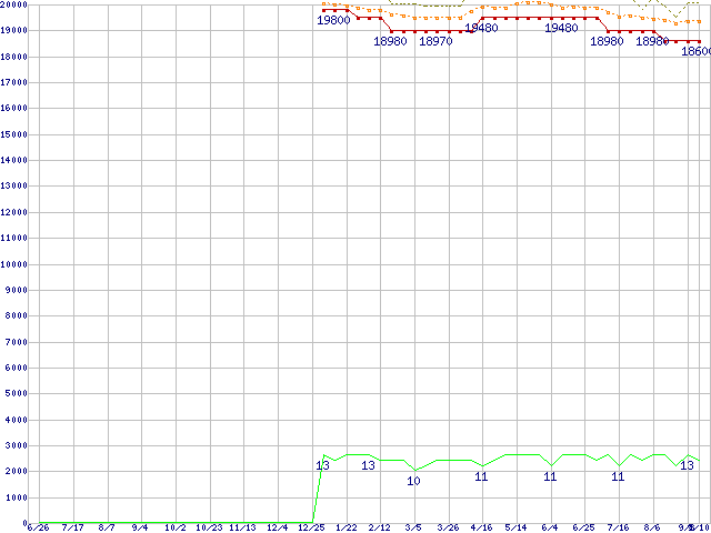 Core i5-661 (3.33GHz)の価格推移↑前グラフ↓次グラフ(2009年6月26日〜2010年9月10日)※このグラフは過去のデータも税率5%相当に調整した税込み相当額のグラフです。●関連グラフCPU主要製品の最安値推移CPU主要製品(最安値1万円〜2万円未満)の最安値推移Intel系CPUの最安値推移LGA1156 (L3キャッシュ4MB,Dual Core,GPU内蔵,Hyper-Threading,TDP 73〜87W)の最安値推移●凡例最安値(点線部は販売店未確認または未調査)平均値最高値ショップ数