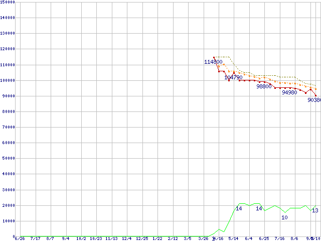 Core i7-980X Extreme Edition (3.33GHz)の価格推移↑前グラフ↓次グラフ(2009年6月26日〜2010年9月10日)※このグラフは過去のデータも税率5%相当に調整した税込み相当額のグラフです。●関連グラフCPU主要製品の最安値推移CPU主要製品(最安値6万円以上)の最安値推移Intel系CPUの最安値推移LGA1366 (QPI 6.4GT/s,L3キャッシュ12MB,6Core,Hyper-Threading,TDP 130W)の最安値推移●凡例最安値(点線部は販売店未確認または未調査)平均値最高値ショップ数