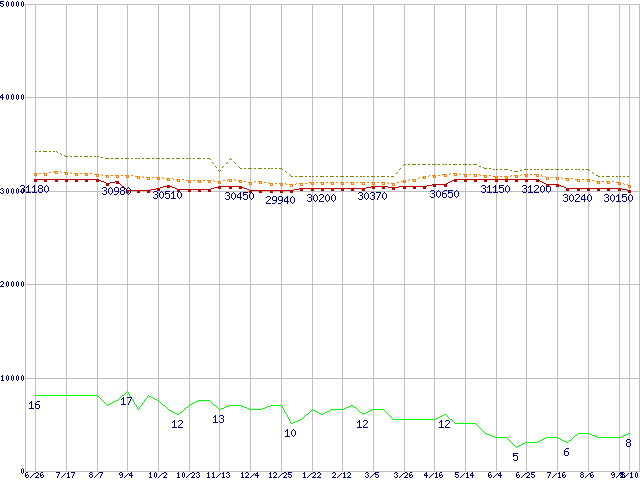 Core 2 Quad Q9650 (3.00GHz,L2 6MB×2)の価格推移↑前グラフ↓次グラフ(2009年6月26日〜2010年9月10日)※このグラフは過去のデータも税率5%相当に調整した税込み相当額のグラフです。●関連グラフCPU主要製品の最安値推移CPU主要製品(最安値2万円〜3万円未満)の最安値推移Intel系CPUの最安値推移LGA775 (FSB 1333MHz,Quad Core,TDP 95W)の最安値推移●凡例最安値(点線部は販売店未確認または未調査)平均値最高値ショップ数