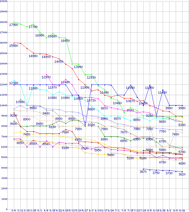 HDD/SSD主要製品(最安値1万円未満)の最安値推移↑前グラフ↓次グラフ(2010年3月4日〜2010年9月16日)※このグラフは過去のデータも税率5%相当に調整した税込み相当額のグラフです。 税率変更や、総額表示方式導入(2004年4月)の影響は除いています。凡例その他2.5インチSSD 64GB (64GB,MLC)ST32000542AS (2TB,32MB)WD10TPVT (1TB,8MB,12.5mm厚)WD7500BPVT (750GB,8MB)WD20EARS (2TB,64MB)HD204UI (2TB,32MB)WD1002FAEX (1TB,64MB)その他2.5インチSSD 32GB (32GB,MLC)WD15EARS (1.5TB,64MB)HD154UI (1.5TB,32MB)WD6400BPVT (640GB,8MB)ST31000528AS (1TB,32MB)0S02601(純正パッケージ品) (1TB,32MB)WD10EALS (1TB,32MB)ST31000520AS (1TB,32MB)0S02598 (500GB,8MB)HTS545050B9A300 (500GB,8MB)WD10EARS (1TB,64MB)WD5000BEVT (500GB,8MB)0S02600(純正パッケージ品) (500GB,16MB)※製品名をクリックすると個別のグラフを表示します※点線部は販売店が確認できなかった、または調査データがないことを示します