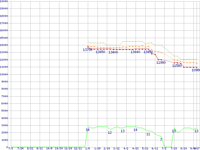 Core i3-540 (3.06GHz)の価格推移↑前グラフ↓次グラフ(2009年7月3日〜2010年9月17日)※このグラフは過去のデータも税率5%相当に調整した税込み相当額のグラフです。●関連グラフCPU主要製品の最安値推移CPU主要製品(最安値1万円〜2万円未満)の最安値推移Intel系CPUの最安値推移LGA1156 (L3キャッシュ4MB,Dual Core,GPU内蔵,Hyper-Threading,TDP 73〜87W)の最安値推移●凡例最安値(点線部は販売店未確認または未調査)平均値最高値ショップ数