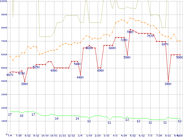PC3-10600 1GB×3枚組みセットの価格推移↑前グラフ↓次グラフ(2009年7月4日〜2010年9月18日)※このグラフは過去のデータも税率5%相当に調整した税込み相当額のグラフです。 税率変更や、総額表示方式導入(2004年4月)の影響は除いています。●関連グラフメモリ主要製品の最安値推移メモリ主要製品(最安値5千円〜1万円未満)の最安値推移PC3-10600(DDR3-1333) DDR3 SDRAM DIMMの最安値推移●凡例最安値(点線部は販売店未確認または未調査)平均値最高値ショップ数