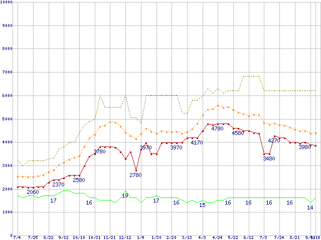 PC2-6400 1GB×2枚組みセットの価格推移↑前グラフ↓次グラフ(2009年7月4日〜2010年9月18日)※このグラフは過去のデータも税率5%相当に調整した税込み相当額のグラフです。 税率変更や、総額表示方式導入(2004年4月)の影響は除いています。●関連グラフメモリ主要製品の最安値推移2GBモジュール/1GBモジュール×2枚の最安値推移メモリ主要製品(最安値5千円未満)の最安値推移PC2-6400(DDR2-800) DDR2 SDRAM DIMMの最安値推移●凡例最安値(点線部は販売店未確認または未調査)平均値最高値ショップ数