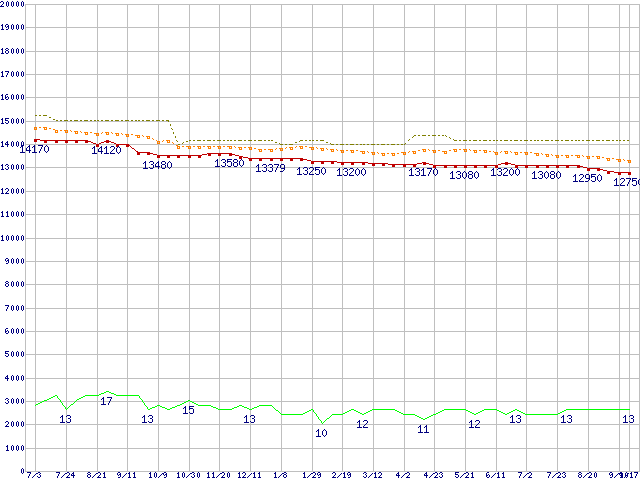 Core 2 Duo E7600 (3.06GHz,L2 3MB)の価格推移↑前グラフ↓次グラフ(2009年7月3日〜2010年9月17日)※このグラフは過去のデータも税率5%相当に調整した税込み相当額のグラフです。●関連グラフCPU主要製品の最安値推移CPU主要製品(最安値1万円〜2万円未満)の最安値推移Intel系CPUの最安値推移LGA775 (FSB 1066MHz,Dual Core,TDP 65W)の最安値推移●凡例最安値(点線部は販売店未確認または未調査)平均値最高値ショップ数