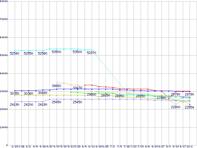 CPU主要製品(最安値2万円〜3万円未満)の最安値推移↑前グラフ↓次グラフ(2010年3月19日〜2010年10月1日)※このグラフは過去のデータも税率5%相当に調整した税込み相当額のグラフです。凡例Core 2 Quad Q9650 (3.00GHz,L2 6MB×2)Core i7-875K (2.93GHz)Core i5-680 (3.6GHz)Core i7-950 (3.06GHz)Core i7-870 (2.93GHz)Core i7-930 (2.80GHz)Core 2 Quad Q9550 (2.83GHz,L2 6MB×2)Phenom II X6 1090T Black Edition (3.2GHz,L2 512KB×6,L3 6MB,TDP 125W)Phenom II X6 1075T (3.0GHz,L2 512KB×6,L3 6MB,TDP 125W)※製品名をクリックすると個別のグラフを表示します※点線部は販売店が確認できなかった、または調査データがないことを示します