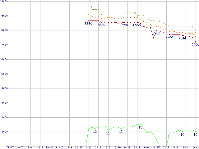 Pentium E6600 (3.06GHz,L2 2MB)の価格推移↑前グラフ(2009年7月17日〜2010年10月1日)※このグラフは過去のデータも税率5%相当に調整した税込み相当額のグラフです。●関連グラフCPU主要製品の最安値推移CPU主要製品(最安値1万円未満)の最安値推移Intel系CPUの最安値推移LGA775 (FSB 1066MHz,Dual Core,TDP 65W)の最安値推移●凡例最安値(点線部は販売店未確認または未調査)平均値最高値ショップ数