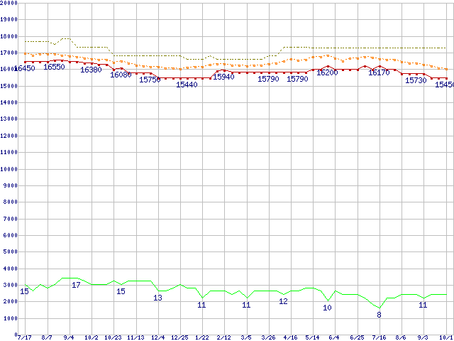 Core 2 Duo E8400 (3GHz,L2 6MB)の価格推移↑前グラフ↓次グラフ(2009年7月17日〜2010年10月1日)※このグラフは過去のデータも税率5%相当に調整した税込み相当額のグラフです。●関連グラフCPU主要製品の最安値推移CPU主要製品(最安値1万円〜2万円未満)の最安値推移Intel系CPUの最安値推移LGA775 (FSB 1333MHz,Dual Core,TDP 65W)の最安値推移●凡例最安値(点線部は販売店未確認または未調査)平均値最高値ショップ数