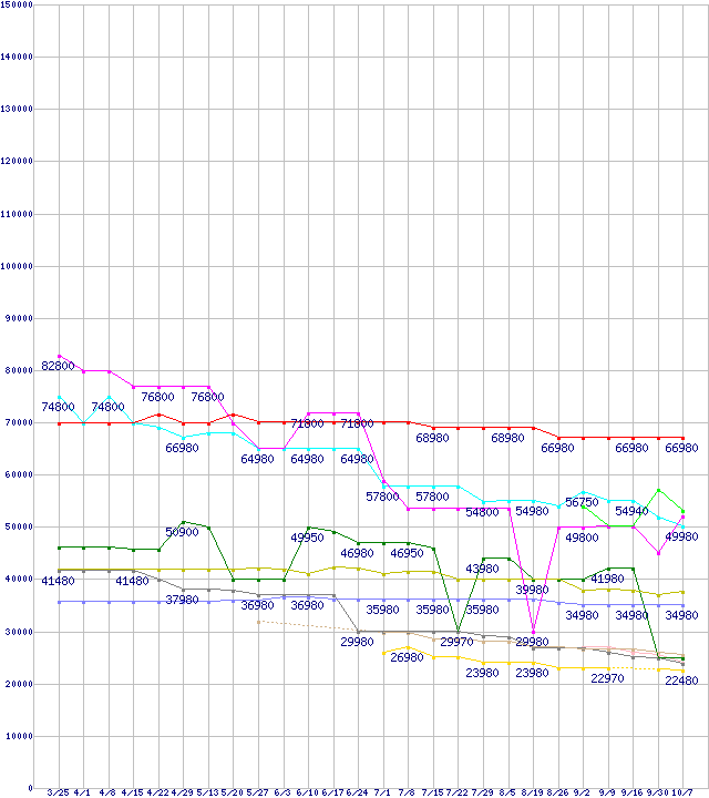 | HDD/SSD主要製品(最安値2万円以上)の最安値推移 |